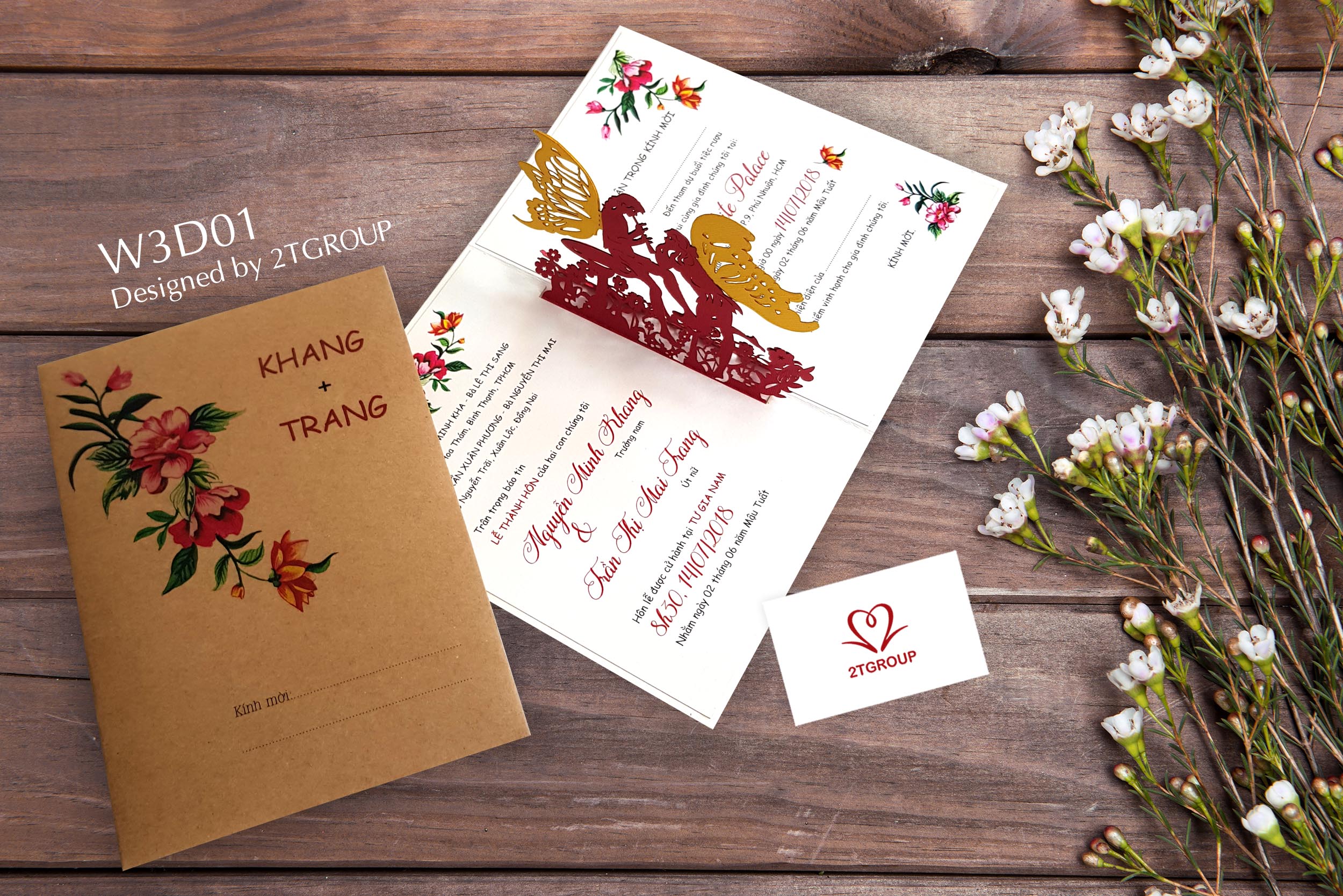 Đây là loại thiệp cưới đặc biệt từ thiệp cưới 2T. Thiệp này sẽ tạo nên cảm xúc cho người nhận bằng những hình ảnh 3d khi mở tấm thiệp ra. Rất đặc biệt và độc đáo cho ngày cưới của bạn đấy. Loại thiệp này thuộc dạng luxury nên giá thành cũng hơi chát nhưng cũng rất đáng cho một đám cưới hoành tráng nhé. Giá từ 15k-30k.